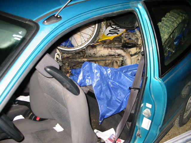 The Race Date was rescheduling for December 8th, and I couldnt find anyone going, and I couldnt bring myself to ask Jonathan again for his truck again- (hed kindly lent it to me for the November junket) , and so I began to imagine my little car w/the YZ400D in the back. A few suggested Id never get it in- but in fact on Thursday night Reg came by, and after having taken the wheels/forks/seat/tank/fenders off the bike, it went right in. I had picked up two new tarps so the car would be protected. Driving through the darkening country, I was happy for my little Honda- which I never have to worry about. The temperature sits on the floor, and stayed there the entire way to California and back. Friday night I was in Corvallis by 7:40pm, and stayed with an old friend there - up at five by myself to start the drive south. It was sharply freezing cold, and quite foggy, and I got lost temporarily in Corvallis even on the familiar route through town because I couldnt see anything. On the freeway the fog was thick as soup, and I hung on to the tailights of a pickup who was doing about 85 in 40 foot visibility. But he was gone. The dark trees whipping by- FOGGY dew! But it began to get light. And chasing a white Bronco who was going about 95mph I got up almost to 100. But I was thinking that maybe I should slow down. Then I saw an Oregon State Patrol Car come whipping across the median and zoom away ahead of me. I nipped off the road to hit a rest stop- and once going again I saw the White Bronco sitting by the way with the OSP behind it. Suddenly in Ashland I drove out of the fog into bright sunlight, and before I knew it I was there.