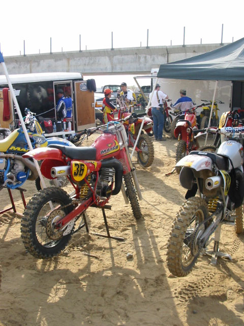 Race 2 Plus 40 Post Vintage - heat (moto 4) I think it was this race that I was chasing someone- and I hounded him until a proper moment to pass. It was Tracy Kehoe - a quiet guy on one of the Maicos. As I went by we almost came together- me going around the outside , and him drifting out. It was as much the looseness of both of us trying to control our bikes as the track was very very choppy with potholes and ruts. Of course it makes me appreciate Woodland a great deal all over again. Race 3 Intermediate Open Historic - main (moto 4) On the line I imagined the holeshot to see if I could will it to happen. But then strangely the bike began to falter and no matter what I did the revs got lower and lower... I now think the engine was loaded up but at the time all I could think was that it was the plug fouling. In desperation I tried revving it, babying it, but to no avail, and the gate went down- I putted slowly to the first corner and pulled off and managed to get it back to the truck at 58rpm, and changed the plug right quick. I roared back out and chased Greg Kendrick for a bit passed him and finished of course 3 laps behind him. Unbeknownst to me Greg wins- he had entered Open Historic after all. Christy Bliss as I said who was taking pics probably wondered where the hell I was... Afterwards I apologized for dispatching her to take photos of me when I wasnt on the track but ignominiously changing plugs back at the pits. |